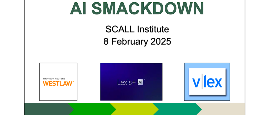 Earlier this month the Southern California Association of Law Libraries – 2025 SCALL Institute held an ‘AI Smackdown’ – comparing vLex, Westlaw, and LexisNexis solutions. … Continue reading vLex Does Well At ‘AI Smackdown’ + Ed Walters Interview