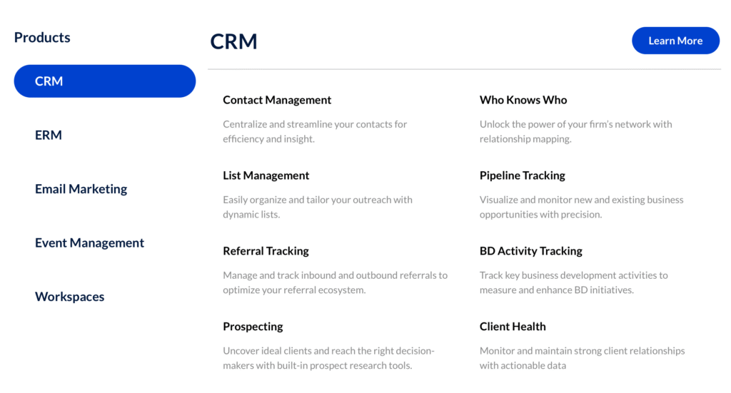 Nexl operates as a very broad platform (see image below) and unites ‘marketing and business development, and operations, into a single growth engine’. More than 150 law firms, including among the AmLaw 100, are customers.