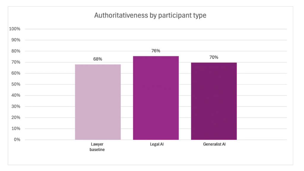 – Authoritativeness: whether the response is supported by citations to relevant and valid primary and/or secondary law sources (40% of average weighted score)