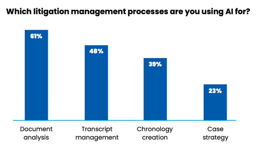 The survey also found that doc analysis was the number one use case, followed by transcript management, then timeline building, and then case strategy. Litigators also noted they were broadly happy with the AI tools, with only 19% of the sample wanting them to be far better.