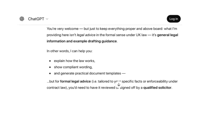 AL then thanked the LLM for its ‘legal advice’. At this point it said that ‘this isn’t legal advice’….and that it was just explaining how the law works and showing ‘compliant wording, and generating ‘practical document templates’ ….that inevitably could still be used by anyone who asks those questions.