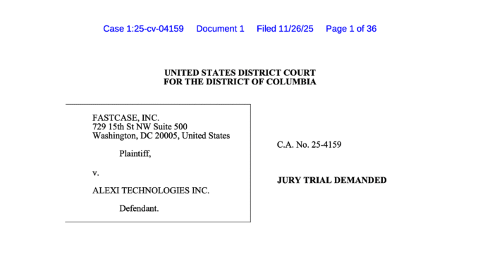 Below is the verbatim text of the initial part of the filing. AL has reached out to executives at Fastcase, now part of Clio, and also Alexi, for comment.