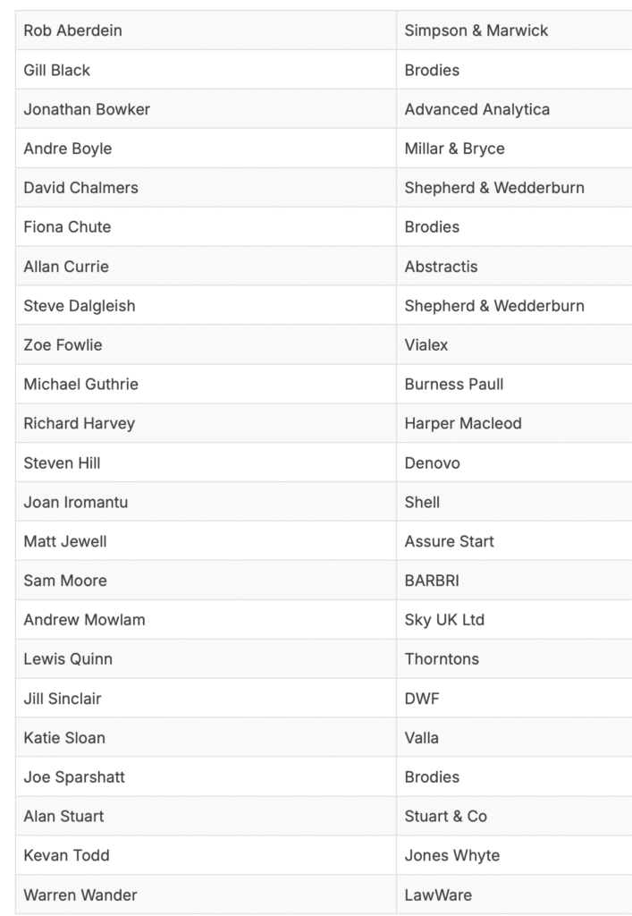 On its website, the Law Society of Scotland maintains a public list of those accredited so far. This is what it says at present and it includes those at law firms, inhouse, and at legal tech companies:
