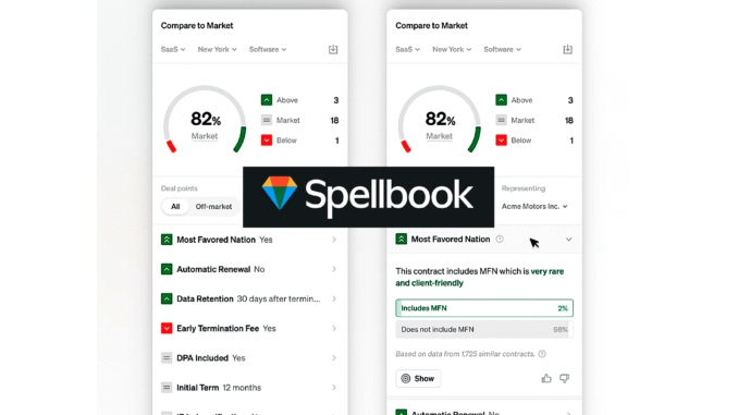 Pioneering legal AI company Spellbook has rolled out its ‘money ball for contracts’ capability, Compare to Market, for all customers, which analyses key contract terms and contrasts them with real market data.