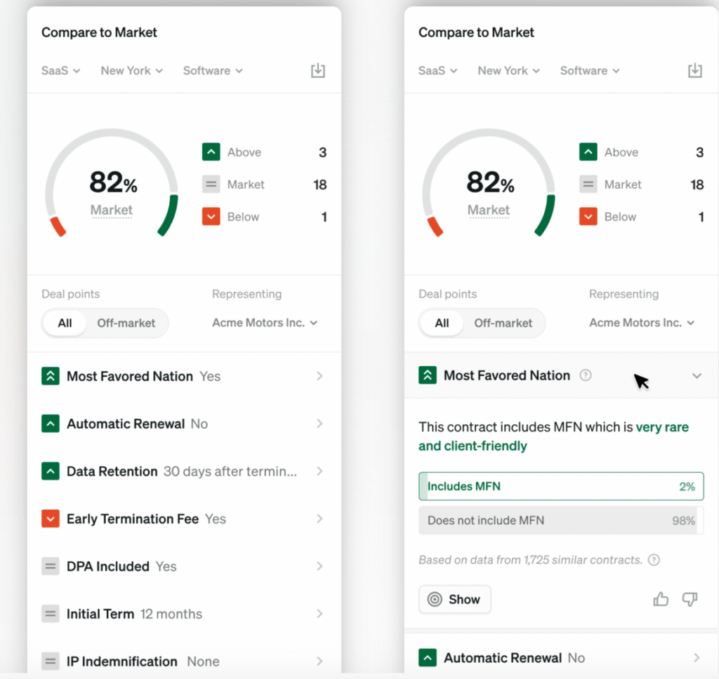 - Compare to Market arms lawyers with objective proof from thousands of similar contracts. When the opposing party claims their terms are market, lawyers will have the facts ready to ensure clients get a fair deal.