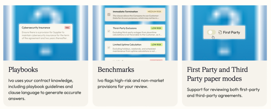 And that all sounds good, but what does Ivo do? Well, it’s a multi-capability platform that handles contract review, playbook development, and has legal research in addition. See below.