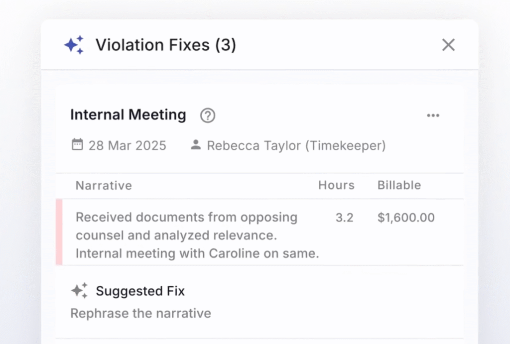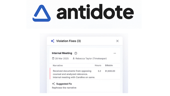 Antidote ‘shifts compliance upstream’, checking all time entries in real-time for Outside Counsel Guidelines (OCG) and internal rule compliance, identifying and flagging those that are potential violations as well as ‘providing autocorrected suggestions that are perfectly written and compliant’.