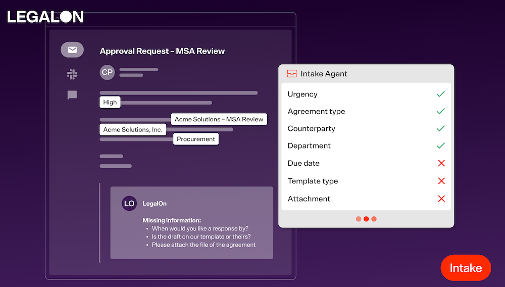 - Intake: Responds to legal service requests from business stakeholders by automatically gathering missing information—a tedious administrative task that slows both legal and business teams.