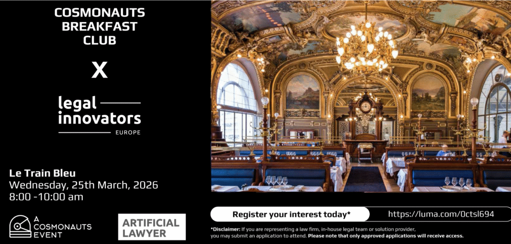 Ahead of the Legal Innovators Europe two-day conference this June, we are holding a special breakfast at the elegant Le Train Bleu restaurant in Paris to meet and greet those involved in legal innovation, and where we can discuss the key themes of our new legal AI era. Join us at 8AM to 10AM on 25th March.