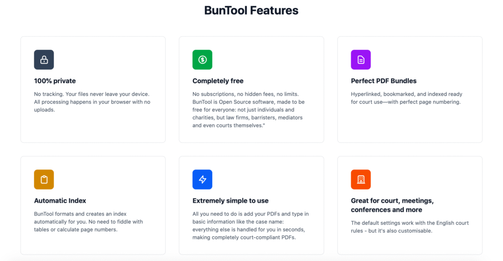 BunTool was different. It’s great that our court system is moving towards e-bundles, but I got so frustrated with the layers of rules and formatting requirements we have to comply with – pagination, hyperlinking, bookmarking, zoom levels and font sizes… it can easily take an experienced lawyer an hour to make a bundle with desktop software. Even then it’s error-prone – and when you need to edit it, you have to go through all the steps again! So, I started by writing a script of my own to handle the main tasks and now two years later, it’s developed into a tool that’s helpful to everyone.