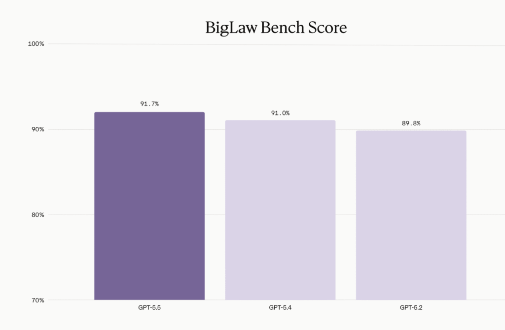 ‘Early access evaluations show GPT-5.5 delivering gains across both transactional and litigation tasks, with particular strength in risk assessment, deal management, and analysis of litigation filings. GPT-5.5 scored 91.7%, up from GPT-5.4’s 91.0%. This is one of the highest scores we’ve seen to date. The model achieved 43% perfect scores and 87% of tasks scored above 0.80, with zero scores below 0.50.’