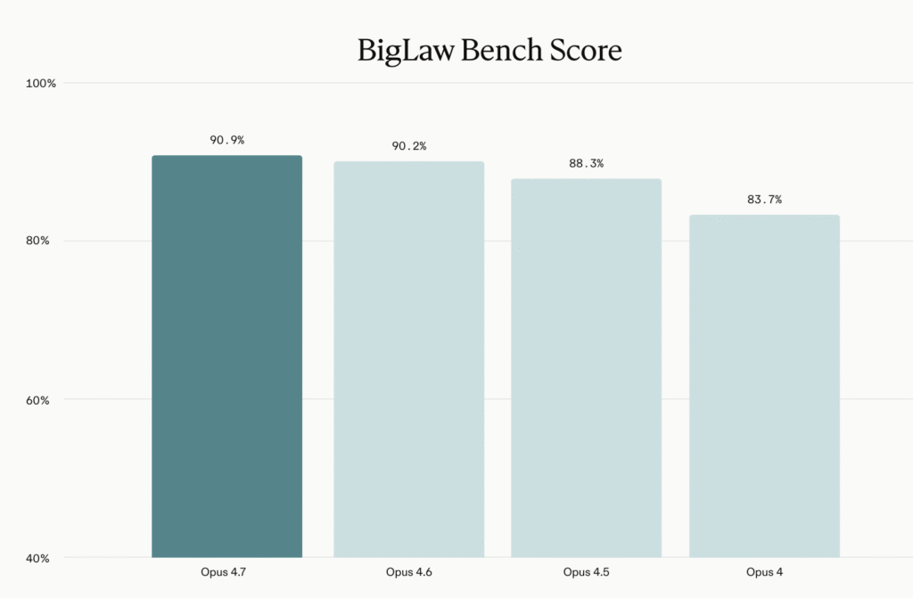 Also, for reference, here is Harvey’s recent BLB review of Anthropic’s Claude Opus 4.7 – which seems to have gotten a mixed reception from LLM experts in the wider market in relation to non-legal uses. Below is its score for legal tasks. As you can see, it’s improved a bit on 4.6 – also by 0.7%.