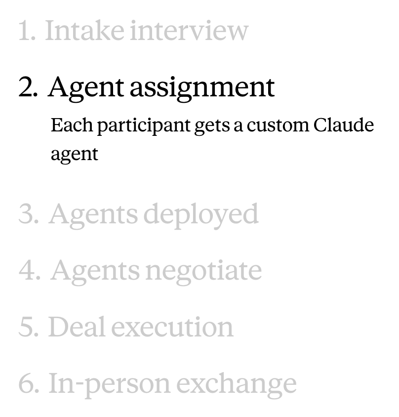 Volunteers on board, we asked Claude to conduct an interview with each one, in a format much like our Anthropic Interviewer. This elicited a wealth of information: what our volunteers wanted to sell, how much they wanted to sell it for, what they were interested in buying, what they’d pay, and any other instructions they had for the negotiation or interaction style of their agents. These responses informed custom system prompts that we set for each person’s AI representative.
