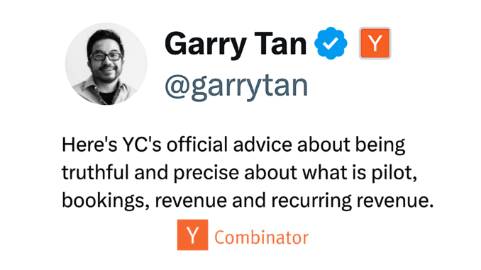 Tan states: ‘Here’s YC’s official advice…. about what is pilot, bookings, revenue and recurring revenue. Founders, particularly first-time founders, need to sear this into their brains. Don’t mistake one tier for another. Be precise, and always be truthful.’
